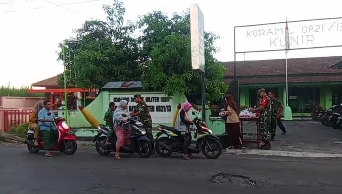 Lumajang, Semangat berbagi dan kepedulian terhadap sesama, Bati Tuud Koramil 0821/13 Kunir Pelda Hernis Junaidi, bersama anggota dan Saka Wira Kartika. Sebanyak 350 paket takjil dibagikan secara gratis kepada penguna jalan dan masyarakat sekitar, di Jalan Raya Kunir Kecamatan Kunir Kabupaten Lumajang, Jawa Timur, Senin (25/3/2024).