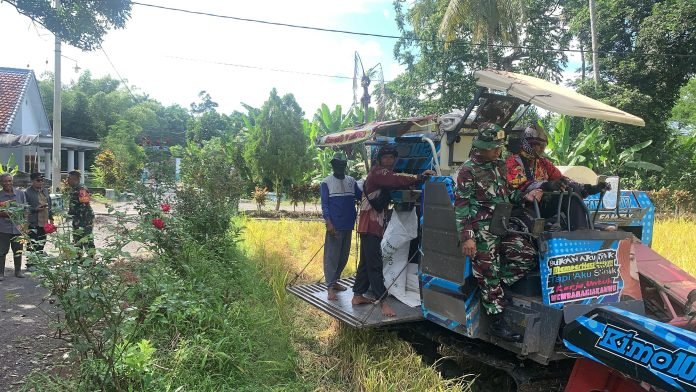 Lumajang, Sebagai bentuk dukungan terhadap program ketahanan pangan nasional, Babinsa Condro Koramil 0821-08/Pasirian, Sertu Joko Pramono, melaksanakan pendampingan panen padi milik Siti Asia Rahayu, anggota Kelompok Tani Jaya Tani di Dusun Gantengan RT 001 RW 002, Desa Condro, Kecamatan Pasirian, Kabupaten Lumajang, Jawa Timur, pada Sabtu (26/4/2025).