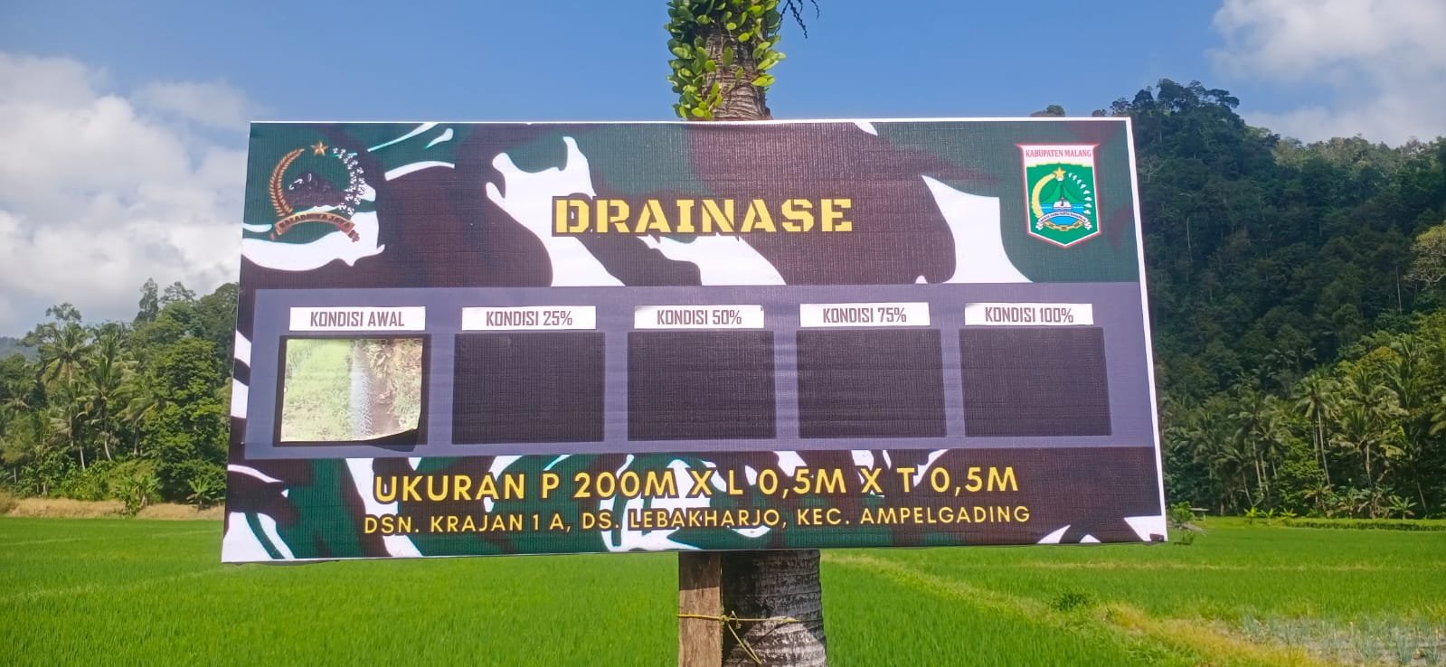 Malang, TMMD ke 126 – Program TNI Manunggal Membangun Desa (TMMD) ke-126 Kodim 0818/Malang-Batu terus menunjukkan kemajuan yang signifikan. Salah satu buktinya terlihat dari pemasangan papan progres pekerjaan drainase di Dusun Krajan 1A RT 014 RW 006 Desa Lebakharjo, Kecamatan Ampelgading, Kabupaten Malang, Kamis (9/10/2025).