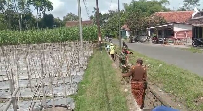 Lumajang, Babinsa Selokbesuki Koramil 0821/02 Sukodono Serda Hery Wahyudi melaksanakan kerja bakti pembersihan selokan saluran drainase bersama masyarakat, di Dusun Krajan Wetan RT 002 RW 001 Desa Selokbesuki Kecamatan Sukodono Kabupaten Lumajang, Jawa Timur, Sabtu (27/1/2024)