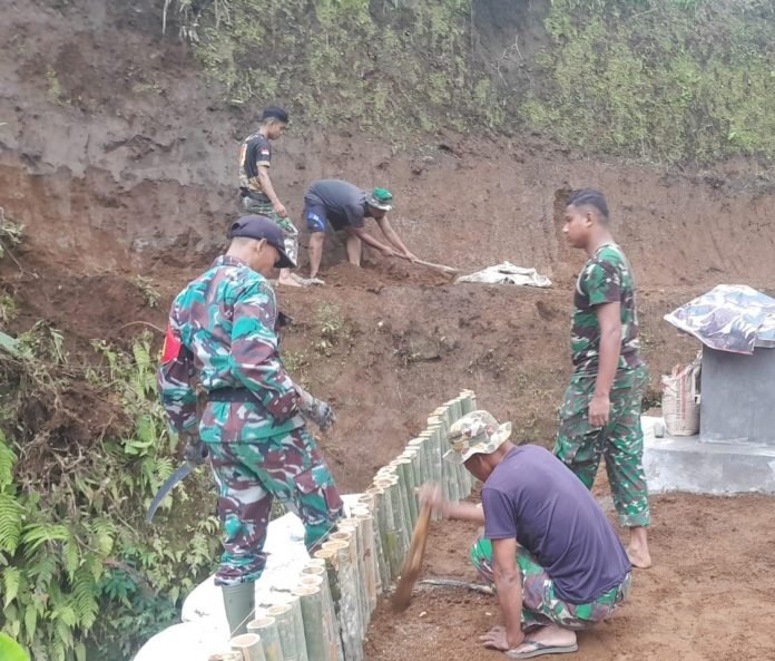 Lumajang, TMMD ke-123, Babinsa Burno bersama personel Satgas TMMD ke-123 Kodim 0821/Lumajang, melakukan penimbunan di samping kanan dan kiri Jembatan Tugu yang terletak di Dusun Tugu, Desa Burno, Lumajang. Penimbunan tersebut dilakukan dengan menggunakan karung yang diisi tanah, yang kemudian dilengkapi dengan pagar bambu untuk menahan tanah agar tidak mengalami longsor. pada Sabtu (15/3/2025),