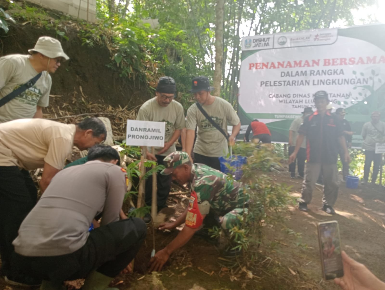 Lumajang, Sebagai upaya melestarikan lingkungan sekaligus mendukung pengembangan kawasan wisata yang berkelanjutan, Babinsa Sidomulyo Koramil 0821-14/Pronojiwo Serma Ikhwanurudin turut serta dalam penanaman bersama dan penyerahan alat ekonomi produktif digelar oleh Dinas Kehutanan Kabupaten Lumajang di area wisata Tumpak Sewu, Desa Sidomulyo, Kecamatan Pronojiwo, Kabupaten Lumajang, Jawa Timur, pada Senin (23/12/2024).