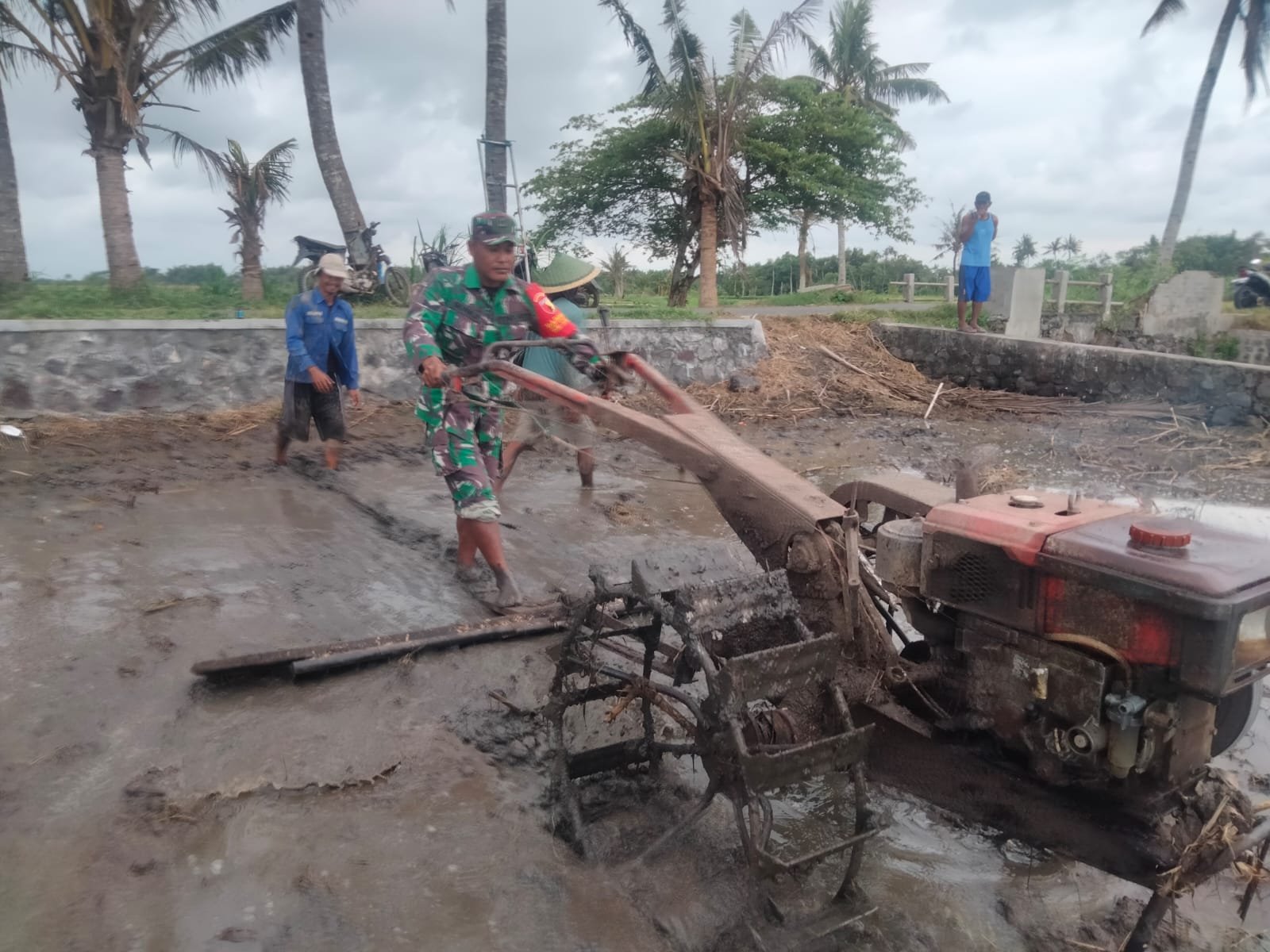 Lumajang, Dalam upaya mendukung program ketahanan pangan dan meningkatkan produktivitas pertanian, Babinsa Desa Jatisari Koramil 0821-10/Tempeh, Serda Bonaji, melakukan pendampingan pengolahan lahan sawah milik Sugeng, salah satu anggota Kelompok Tani (Poktan) Karya Tani di Dusun Karang Tengah, Desa Jatisari, Kecamatan Tempeh, Kabupaten Lumajang, Jawa Timur. Minggu (22/12/2024).