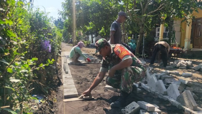 Lumajang, Babinsa Desa Jatiroto Koramil 0821-12/Jatiroto, Sertu Ahmad Agus Budi Santoso, melaksanakan pendampingan karya bakti pavingisasi jalan setapak sepanjang 122 meter di Dusun Kotokan RT 003 RW 010, Desa Jatiroto, Kecamatan Jatiroto, Kabupaten Lumajang, Jawa Timur, Senin (23/12/2024).
