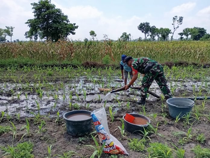Lumajang, Dalam upaya mendukung ketahanan pangan nasional, Babinsa Kepuharjo Koramil 0821-01/Lumajang, Sertu Totok Hardianto, melaksanakan pendampingan pengairan lahan jagung seluas 2 hektare milik Saiful, anggota Kelompok Tani (Poktan) Glundung Makmur, di Dusun Glundung RT 002 RW 007, Kelurahan Kepuharjo, Kabupaten Lumajang, Jawa Timur, Sabtu (7/12/2024).