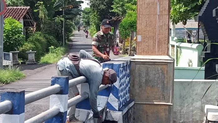 Lumajang, Babinsa Tekung Koramil 0821-15/Tekung, Serka Hariyanto, bersama Dinas Pekerjaan Umum (PU) dan warga Dusun Magersari melaksanakan kegiatan kerja bakti pengecatan tembok jembatan di RT 004 RW 002 Desa Tekung, Kecamatan Tekung, Kabupaten Lumajang, Jawa Timur, Selasa (3/12/2024).