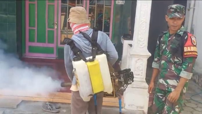 Lumajang, Dalam upaya mencegah penyebaran penyakit demam berdarah, Babinsa Yosowilangun Lor Koramil 0821/11 Yosowilangun, Serda Dafit Murdianto, bersama dengan Bidan Desa Yosowilangun Lor, Dian Pujiningtyas, SST, melaksanakan pendampingan kegiatan fogging puluhan rumah, di Dusun Jombang RT 038 RW 007, Desa Yosowilangun Lor, Kecamatan Yosowilangun Lor, Kabupaten Lumajang, Jawa Timur, Kamis (6/6/2024).