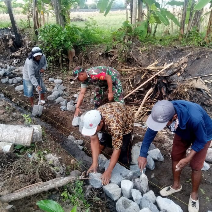 Lumajang, Dalam upaya mendukung pembangunan infrastruktur desa sekaligus mempererat kemanunggalan TNI dengan rakyat, Babinsa Sumberanyar Koramil 0821-16/Rowokangkung, Sertu Imam Munandar, turun langsung membantu warga melaksanakan kegiatan kerja bakti membangun talut penahan tanah di Dusun Sadeng RT 016 RW 006 Desa Sumberanyar, Kecamatan Rowokangkung, Kabupaten Lumajang, Jawa Timur, Rabu (24/9/2025).