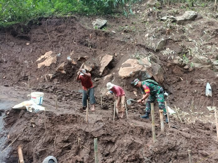 Lumajang, Dalam rangka mendukung pengembangan potensi wisata desa, Babinsa Kertowono Koramil 0821-04/Gucialit Koptu Mustaji turut serta mendampingi pembangunan akses jalan menuju objek wisata Antrukan Pawon yang terletak di Dusun Sidomulyo RT 002 RW 004, Desa Kertowono, Kecamatan Gucialit, Kabupaten Lumajang, Jawa Timur, Kamis (7/8/2025).