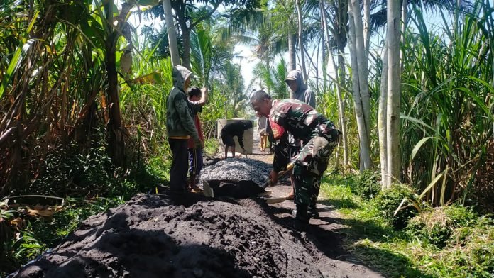 Lumajang, Dalam upaya meningkatkan kualitas infrastruktur desa, Babinsa Klakah Koramil 0821-05/Klakah, Serda Luthfiyullah, melaksanakan pendampingan kegiatan Karya Bakti pengecoran jalan sepanjang kurang lebih 175 meter yang berlokasi di Dusun Gunung Dulang RT 036 RW 016 Desa Klakah, Kecamatan Klakah, Kabupaten Lumajang, Jawa Timur, pada Senin (28/7/2025).