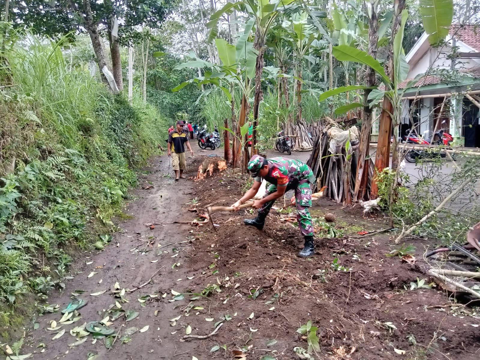 Lumajang, Upaya mendukung kelancaran mobilitas masyarakat di wilayah binaan, Babinsa Kalisemut Koramil 821/20 Padang Serda Hendrik, bersama warga bergotong royong melaksanakan Kerja bakti pelebaran jalan, di Dusun Kancu RT 012 RW 005 Desa Kalisemut Kecamatan Padang Kabupaten Lumajang, Jawa Timur, Senin (5/2/2024).