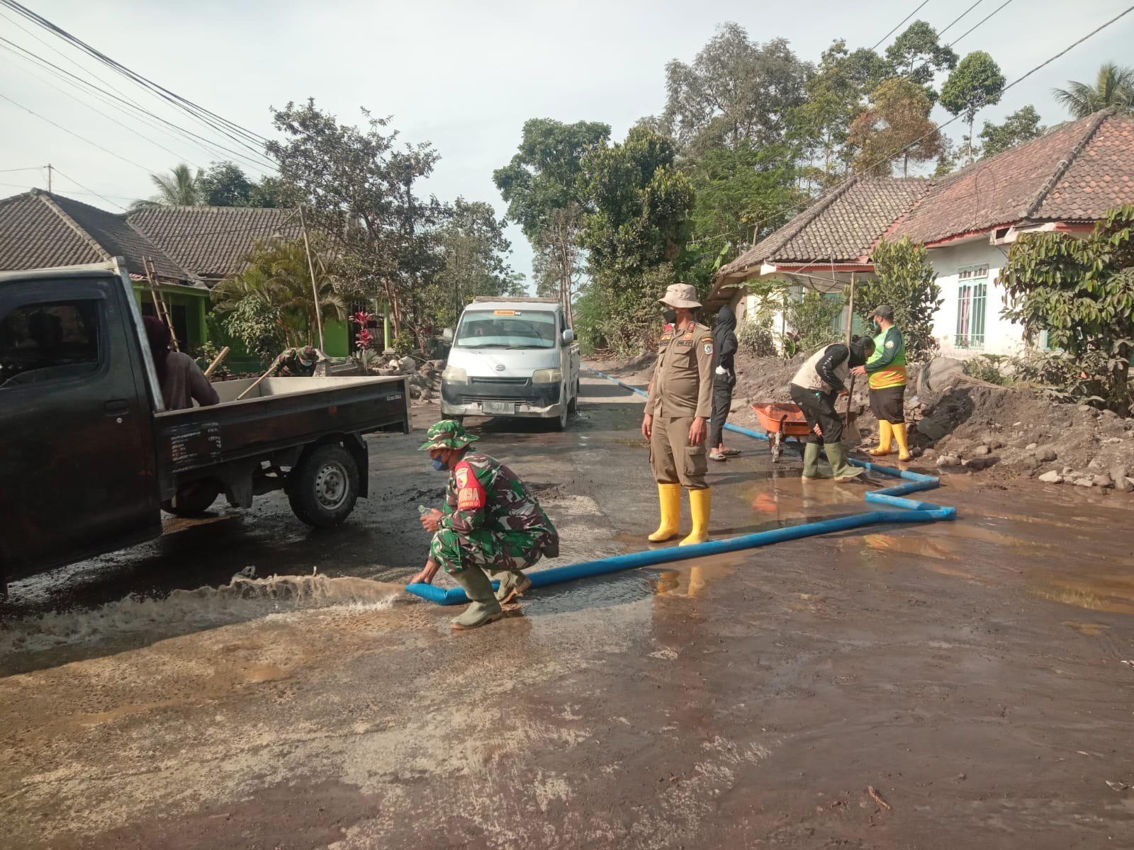 Dengan mengerahkan alat manual hingga peralatan pendukung lainnya, personel bersama warga bekerja bahu-membahu menyingkirkan timbunan pasir, abu, dan batuan vulkanik yang menutup ruas jalan.