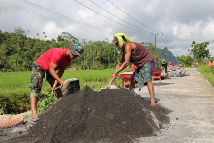 Dengan semangat gotong royong yang tinggi, mereka mengaduk pasir, semen, dan kerikil menggunakan sekop secara manual. Aktivitas ini dilakukan di pinggir jalan desa yang dikelilingi hamparan sawah hijau, menjadi pemandangan khas kerja lapangan yang penuh kekompakan antara TNI dan masyarakat.