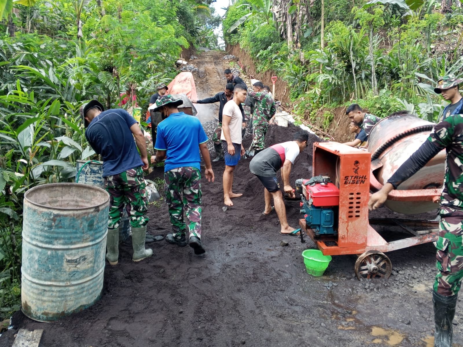 Semangat kebersamaan dan gotong royong sangat terasa dalam kegiatan ini. Warga Dusun Tugu turut serta membantu dalam proses pengecoran, mulai dari pengangkutan material hingga proses finishing jalan. Salah satu warga, Bapak Suroto, mengungkapkan rasa syukurnya atas perhatian dan bantuan dari TNI.