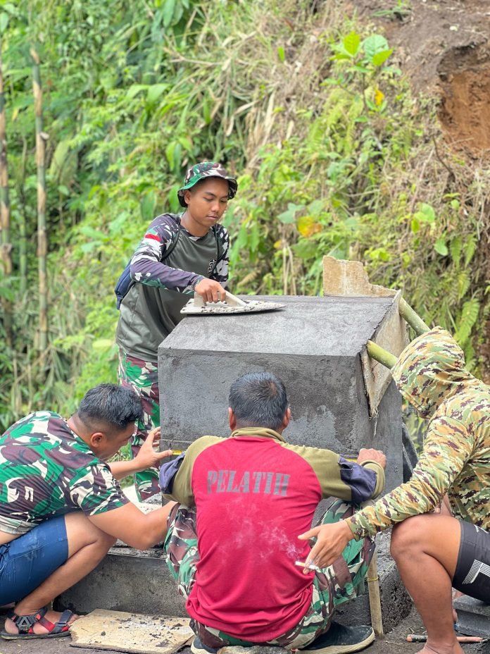Lumajang, TMMD ke-123, Satuan Tugas (Satgas) TNI Manunggal Membangun Desa (TMMD) ke-123 Kodim 0821/Lumajang terus menggenjot penyelesaian pembangunan prasasti yang berlokasi di Dusun Tugu, Desa Burno, Kabupaten Lumajang, Selasa (11/3/2025). Pembangunan prasasti ini menjadi simbol keberhasilan dan dedikasi TNI dalam mendukung percepatan pembangunan di wilayah pedesaan.
