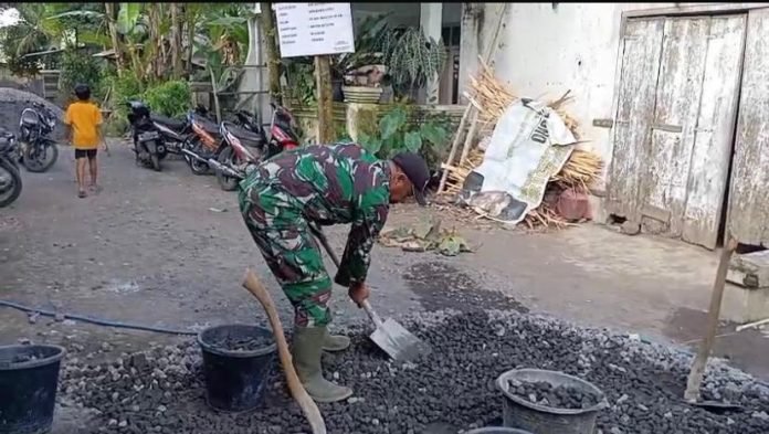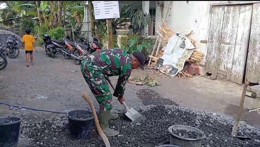 Lumajang, Dalam semangat kebersamaan dan meningkatkan infrastruktur desa, Babinsa Nguter Koramil 0821-08/Pasirian, Sertu Eko Prasetyo, bersama perangkat desa dan masyarakat Dusun Basuki, melaksanakan kerja bakti pengecoran jalan rabat beton di RT 004 RW 002 Desa Nguter, Kecamatan Pasirian, Kabupaten Lumajang, Jawa Timur, Sabtu (28/6/2025).