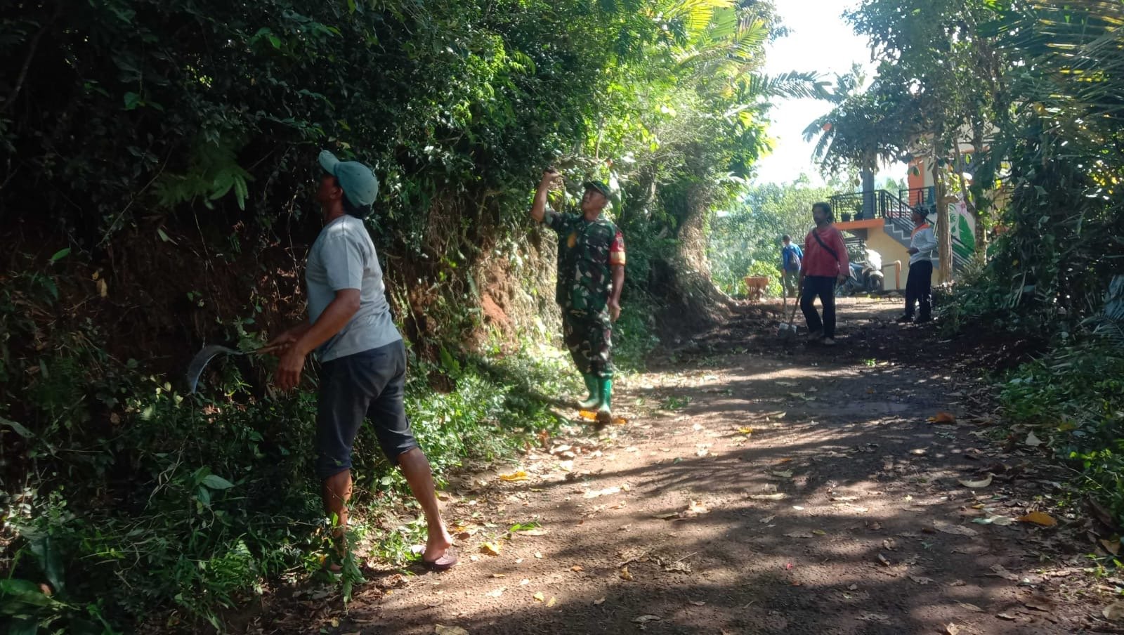 Kegiatan kerja bakti tersebut dilakukan dengan membersihkan rumput liar, sampah, serta material yang menutup sebagian badan jalan. Warga secara gotong royong bersama Babinsa bahu membahu menggunakan peralatan sederhana untuk memastikan akses jalan tetap bersih, rapi, dan nyaman dilalui masyarakat.