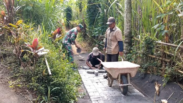 Semangat Kebersamaan! Babinsa Dadapan Bantu Warga Pasang Paving Blok Jalan Dusun