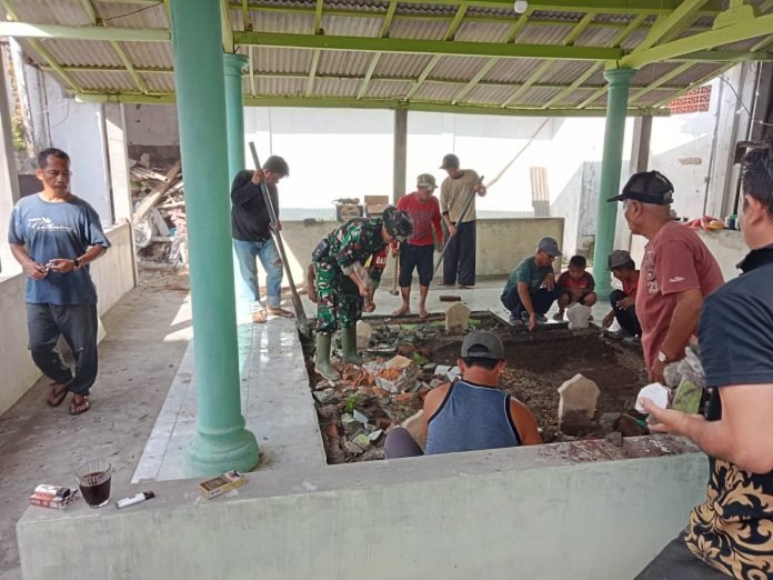 Lumajang, Dalam upaya menjaga kebersihan dan kelestarian tempat pemakaman, Babinsa Tukum Koramil 0821-15/Tekung, Serda Haeruddin, bersama santri dan warga sekitar melaksanakan kerja bakti perbaikan lantai makam keluarga pengasuh Pondok Pesantren Mansyaul Huda, Dusun Krajan RT 006 RW 002, Desa Tukum, Kecamatan Tekung, Kabupaten Lumajang Jawa Timur, pada Sabtu (15/2/2024)