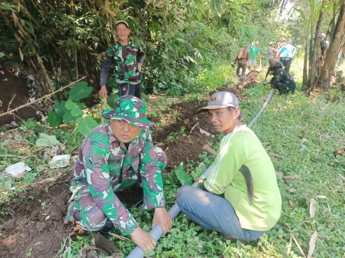Lumajang, Dalam upaya meningkatkan ketersediaan sarana air bersih bagi masyarakat, Babinsa Kalisemut Koramil 0821-20/Padang, Serda Hendrik, bersama warga melaksanakan kegiatan kerja bakti pemasangan pipa air bersih di Dusun Bulukubung RT 020 RW 004, Desa Kalisemut, Kecamatan Padang, Kabupaten Lumajang, Jawa Timur, pada Kamis (9/10/2025).