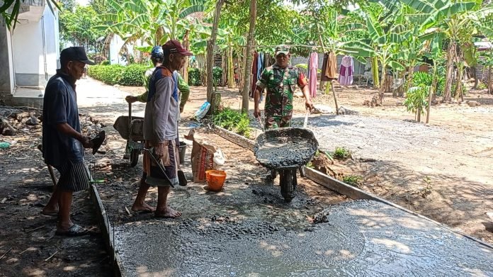 Lumajang, Wujud dedikasinya dalam mendukung pembangunan di wilayah binaannya. Babinsa Sukosari Koramil 0821-12/Jatiroto, Serka Samsuliadi Dwi Purwanto, bersama warga turut serta dalam karya bakti pembangunan jalan rabat beton sepanjang 200 meter di Dusun Sukosari Barat, Desa Sukosari, Kecamatan Jatiroto, Kabupaten Lumajang, Jawa Timur, Senin (2/12/2024).