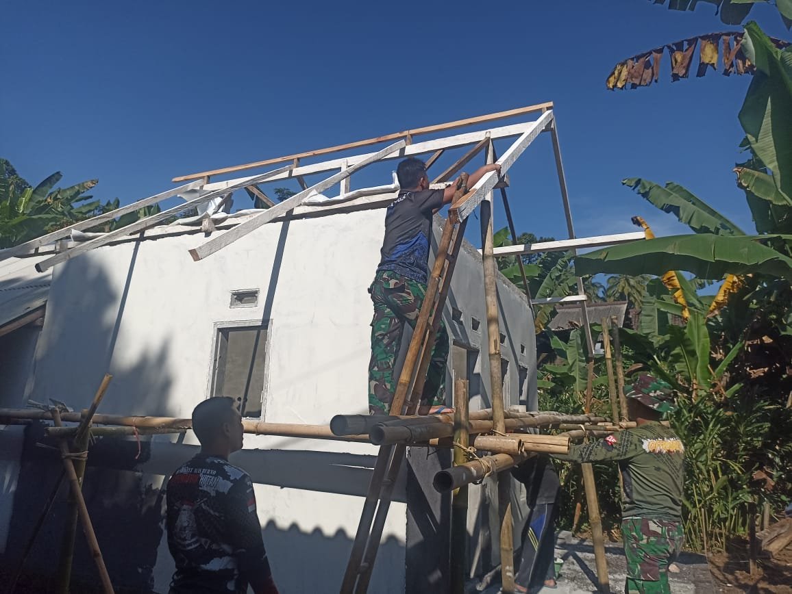 “Kami bersama tim berusaha sebaik mungkin untuk mempercepat proses pembangunan rumah ini. Pemasangan rangka atap menjadi tahap krusial dalam pengerjaan RTLH, dan kami pastikan dikerjakan dengan kualitas yang baik agar kokoh dan tahan lama,” ujar Kopda Rizal.