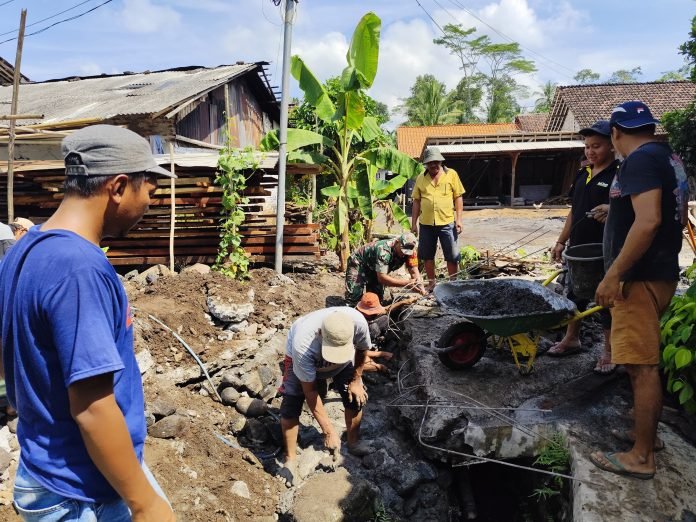 Lumajang, Dalam upaya mendukung pembangunan infrastruktur desa, Babinsa Jatiroto Koramil 0821-12/Jatiroto, Sertu Ahmad Agus Budi Santoso, melaksanakan pendampingan kegiatan pengecoran gorong-gorong dan jalan di Dusun Kotakan RT 001 RW 008, Desa Jatiroto, Kecamatan Jatiroto, Kabupaten Lumajang, Jawa Timur pada Kamis (8/5/2025).