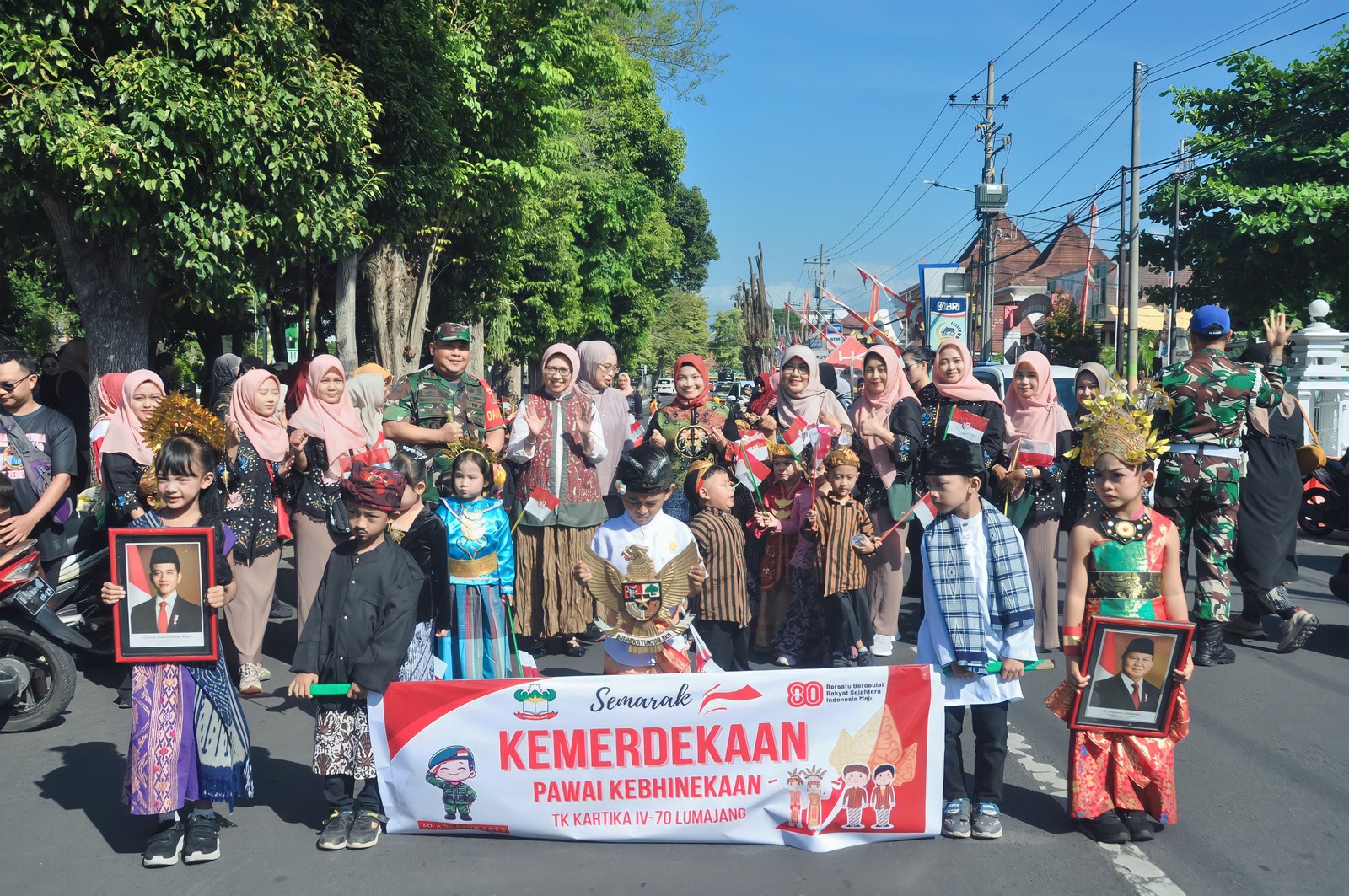 Lumajang. Dalam rangka memeriahkan HUT ke-80 Kemerdekaan Republik Indonesia, TK Kartika IV-70 Lumajang menggelar pawai kostum adat dengan mengusung tema “Semarak Kemerdekaanku Berke-Bhinekaan”. Kegiatan berlangsung meriah pada di seputaran Alun-Alun Lumajang, dengan melibatkan siswa-siswi yang tampil mengenakan busana tradisional dari berbagai daerah Nusantara. Sabtu(30/8/2025)