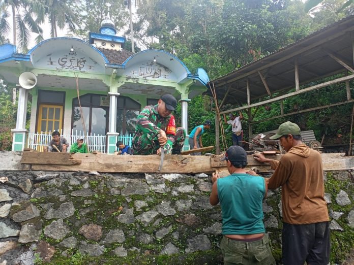 Tumbuhkan Semangat Gotong Royong, Babinsa Renovasi Pagar Musala Bareng Warga