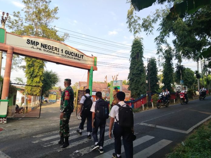 Wujud Kepedulian Keselamatan Warga, Babinsa Gucialit Bantu Penyebrangan Siswa Sekolah