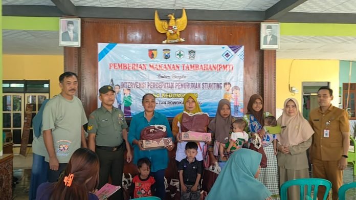 Lumajang, Bamin Tuud Koramil 0821/16 Rowokangkung, Serka Ii Supriadi, bersama Babinsa aktif terlibat dalam mendampingi kegiatan sosialisasi pencegahan stunting dan pemberian makanan tambahan (PMT) yang digelar oleh UPT Puskesmas Sumbersari, bertempat di Balai Desa Kedungrejo Kecamatan Rowokangkung, Kabupaten Lumajang, Jawa Timur pada Selasa (7/5/2024).