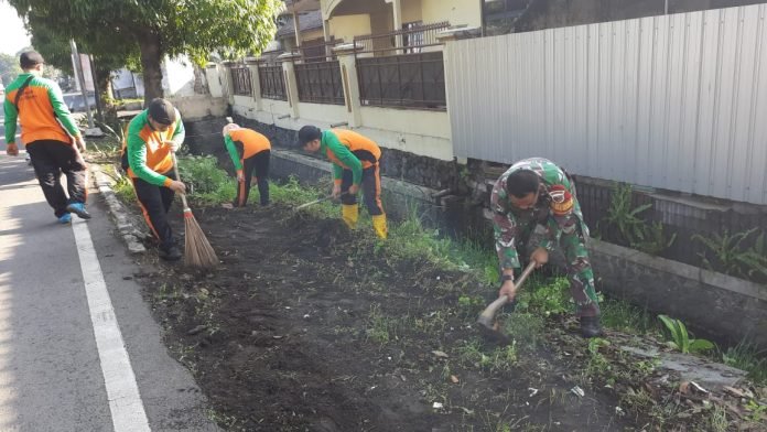 Lumajang, Wujudkan kebersamaan, Babinsa Karangsari Koramil 0821/02 Sukodono Sertu Handoko, melaksanakan kegiatan pembersihan kanan kiri jalan sepanjang 300 di Jalan Gatot Subroto RT 003 RW 004 Desa Karangsari Kecamatan Sukodono Kabupaten Lumajang, Jawa Timur, Sabtu (17/2/2024).