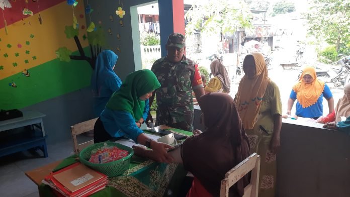 Lumajang, Sebagai upaya meningkatkan kesehatan masyarakat, Babinsa Kertosari Koramil 0821-17/Pasrujambe, Sertu Ade Dian Febrianto, turut mendampingi Bidan Desa dalam kegiatan Posyandu Lansia di Balai Posyandu Harapan Jaya, Dusun Kebonan, Desa Kertosari, Kecamatan Pasrujambe, Kabupaten Lumajang, Jawa Timur, pada Rabu (19/3/2025).